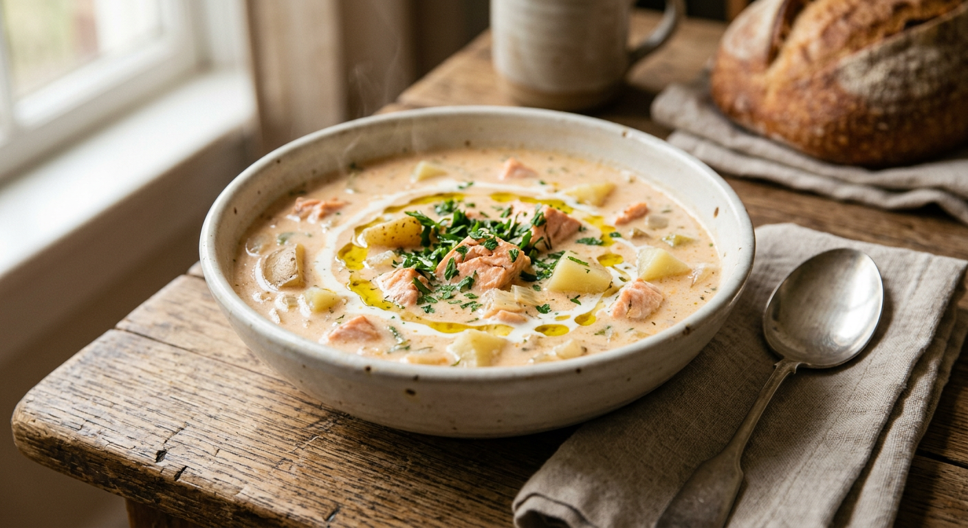 겨울 아침, 아이 입맛 사로잡는 '연어 감자 크림 수프' 레시피를 소개합니다. 부드럽고 영양 가득한 메뉴로 건강하고 따뜻한 아침을 선물하세요!